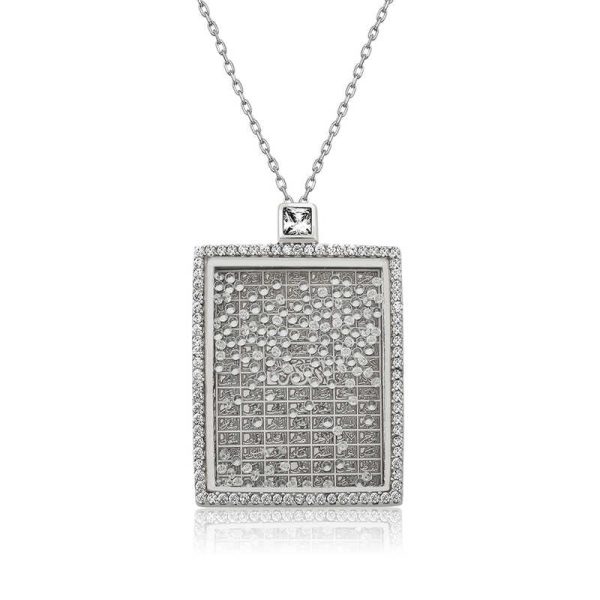 Esmaül Hüsna, en güzel isimler anlamına gelen Allah’ın doksan dokuz ismine verilen addır. Esmaül Hüsna’nın yazılı olduğu, çerçevesinde ve içinde zirkon taşların yer aldığı bu harika kolye 925 ayar gümüşten imal edilmiştir. Gümüş üzerine rodyum kaplama yapılmıştır. Rodyum kaplama yapılmış gümüş kolye modelleri parlaklığını uzun süre muhafaza eder. Kolye ile birlikte gelecek olan zincir de gümüştür ve uzunluğu 45 cm’dir. Bu özel tasarım kolye; doğum günü hediyesi, sevgililer günü hediyesi veya annelere hediye olarak özel günlerde tercih edilebilecek mükemmel bir seçenektir. Tüm gümüş kolye modellerimizde olduğu gibi gümüş Esmaül Hüsna kolye modeli de el emeği ile üretilmiştir. Gümüş ve değerli taşlar nedeniyle belirtilen ürün ağırlığında ± %10 sapma olabilmektedir.