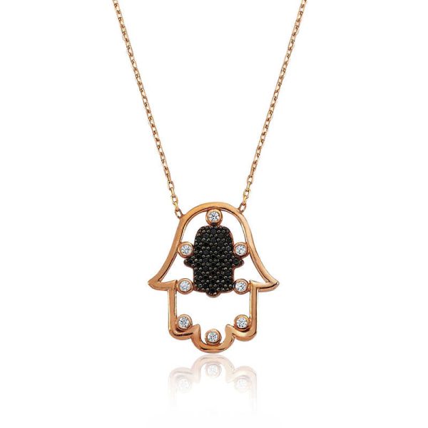 Hz. Fatma’nın eli olarak bilinse de arapçada “hamse” diye anılır. Hamse, beş anlamına gelir ve bir elin parmak sayısını gösterir. Hz. Fatma bir gün mutfakta helva kavururken, eşi Hz. Ali görür ve pişen helvaya elini daldırır ancak hiç bir şey olmaz, helvayı böyle kavurmayı devam eder. O günden sonra elinin kutsallığına, gücüne adeta yenilmezliğine inanılır. Her güçlük adeta onun eliyle aşılacaktır. Bu harika tasarım Fatma eli bayan kolye modeli 925 ayar gümüş ile imal edilmiştir. Gümüş üzerine rose altın kaplama yapılmıştır. Rose altın kaplama yapılan gümüş bayan kolye modelleri parlaklığını uzun süre muhafaza eder. Kolye üzerinde bulunan siyah ve beyaz taşlar zirkondur. Gümüş Fatma eli bayan kolye modelinde olduğu gibi tüm gümüş bayan kolye modelleri el emeği ile üretilmiştir. Gümüş ve değerli taşlar nedeniyle belirtilen ortalama ürün ağırlığında ± %10 sapma olabilmektedir.