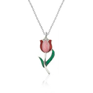 Rengi ve şekli açısından sevgilinin yüzüne, yanağına, dudağına benzetilen ‘Lale’, yine rengi dolayısıyla aşığın yanağına ve içindeki tomurcuklarıyla da aşığın gönlündeki yaralara benzetilmektedir. Tasavvuf düşüncesinde ise; Lale’nin renkli yapraklarının yukarıya doğru olması halinin, bir dervişin dua edişindeki edayı andırdığı kabul ediliyor. Gümüş üzerine rodyum kaplama yapılmıştır. Rodyum kaplama yapılan gümüş bayan kolyeler parlaklığını uzun süre muhafaza eder ve oksitlenmesi gecikir. Gümüş olan zincirin boyu ortalama 45 cm’dir. Tüm gümüş bayan kolye modellerinde olduğu gibi gümüş lale bayan kolye modeli de el emeği ile üretilmiştir. Gümüş ve değerli taşlar nedeniyle belirtilen ortalama ürün ağırlığında ± %10 sapma olabilmektedir. Not : Üzerine yazılacak harfi not kısmında belirtiniz.