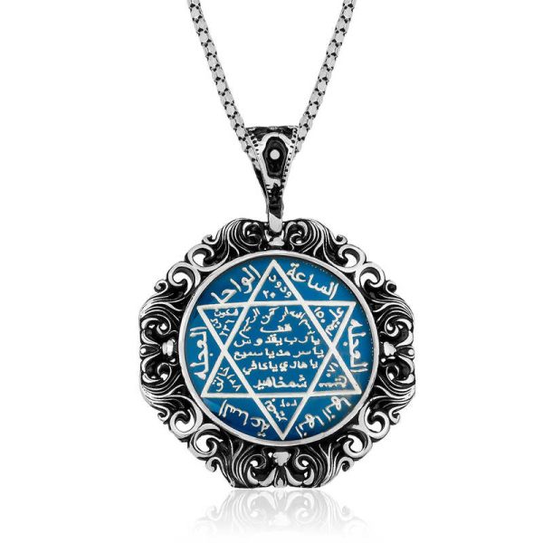 İslam geleneğinde “Süleyman Mührü” köklü bir geçmişe sahiptir. Yahudilik ve Hıristiyanlıkta İslam geleneğinde altı köşeli yıldız şeklinde olduğuna inanılan Süleyman Mührü’nün beş köşeli yıldız şeklinde olduğu kabul edilir. Arkeolojik bulgular altı köşeli yıldızın beş köşeli yıldızdan üç bin yıl önce kullanıldığını kanıtlar. Altı köşeli yıldız yaygın olarak “Davut Yıldızı” ismiyle bilinir. Bugün Davut Yıldızı İsrail bayrağında tanrının koruyuculuğunun bir simgesi olarak muhafaza edilmekle birlikte Yahudi kimliğinin evrensel bir sembolüdür. Gümüş büyük mavi mineli Süleyman Mührü kolye 925 ayar gümüşten imal edilmiştir. Bu kolye üzerine oksit kaplama yapılmıştır. Oksit kaplama yapılan gümüş ürünler eskitme bir görünüme sahip olur. Zincir uzunluğu 55 cm’dir. Tüm gümüş bayan kolye modellerinde olduğu gibi gümüş mavi mineli büyük Süleyman Mührü bayan kolye modeli de el emeği ile üretilmiştir. Gümüş ve değerli taşlar nedeniyle belirtilen ortalama ürün ağırlığında ± %10 sapma olabilmektedir.