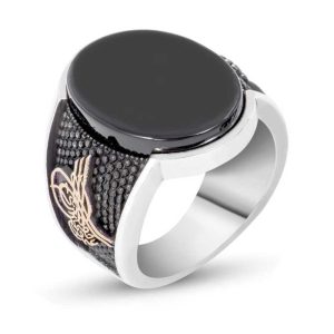 Gümüş Siyah Taşlı Tuğralı Erkek Yüzük