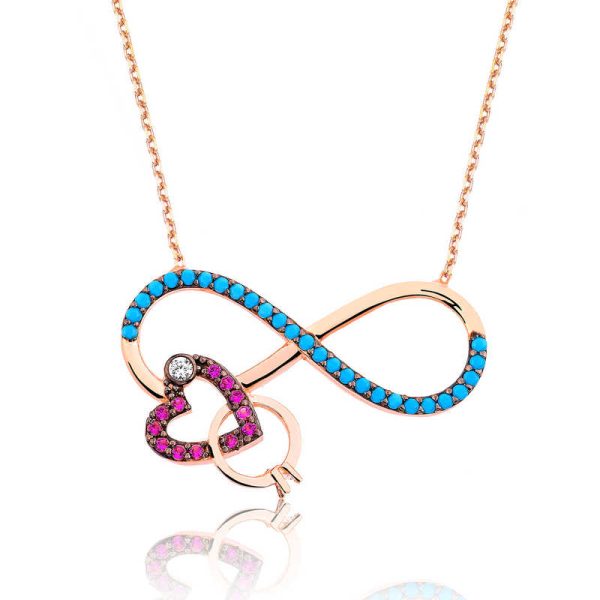 Sevgilinize sonsuz aşkı ifade etmenin en güzel ve en anlamlı yollarından biri sonsuzluk kolyesidir. Şık tasarım olan özel kolye ile sevdiğinize olan sonsuz aşkınızı ifade edebilir, sonsuza kadar birlikte olacağınız mesajı verebilirsiniz. Bu mükemmel kolye; 925 ayar gümüşten imal edilmiştir. Gümüş kolye üzerine rose kaplama yapılmıştır. Rose kaplama yapılan bayan kolyeler parlaklığını uzun süre muhafaza eder, gümüş rengini pembe renge dönüştürür ve oksitlenmeyi geciktirir. Zincir boyu ortalama 45 cm’dir. Tüm gümüş bayan kolyelerde olduğu gibi bu gümüş sonsuz aşk bayan kolye de tamamı el emeği ile üretilmiştir. Kolye üzerindeki taşlar zirkon ve firuzedir. Gümüş ve değerli taşlar nedeniyle belirtilen ortalama ürün ağırlığında ± %10 sapma olabilmektedir.
