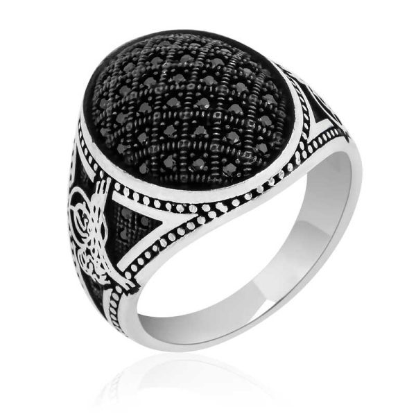 Gümüş Tuğralı Zirkon Siyah Taşlı Erkek Yüzük
